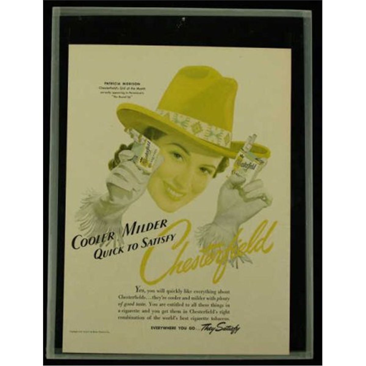 1941 Chesterfield Cigarette advertiser features cowgirl Patricia Morison who stared in "The Round Up" movie. Condition is excellent, no folds or tears, 10" X 14'.