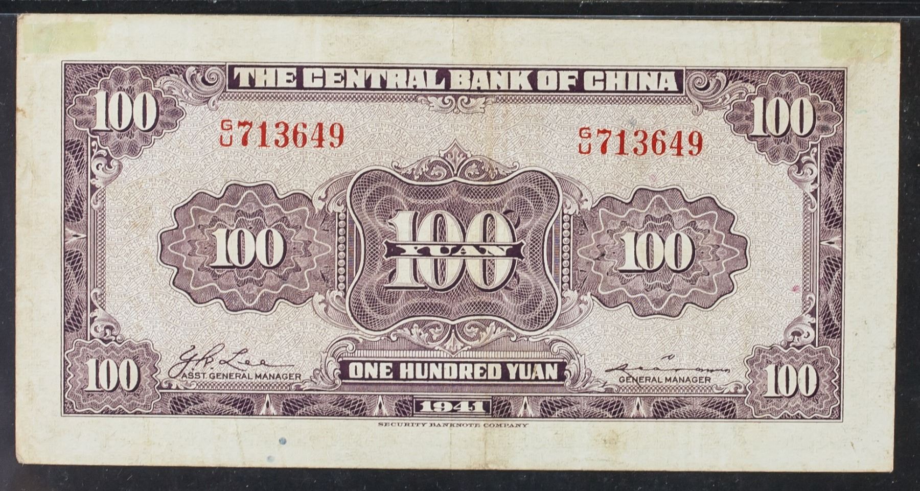 1941 China Republic 100 Yuan banknote, the Central Bank of China, serial number GU 713649, very fine condition, 8.2 x 16 cm