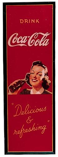 18"x54". Featuring girl and bottle in center. A few touched up areas around the word "delicious". Some gloss differences the bottom 18" of the sign. Slightly dull and dirty surface can be improved with wax. Some minor scratches and small dents and light wear on the border and edges. Cond. 6.8-7.3.