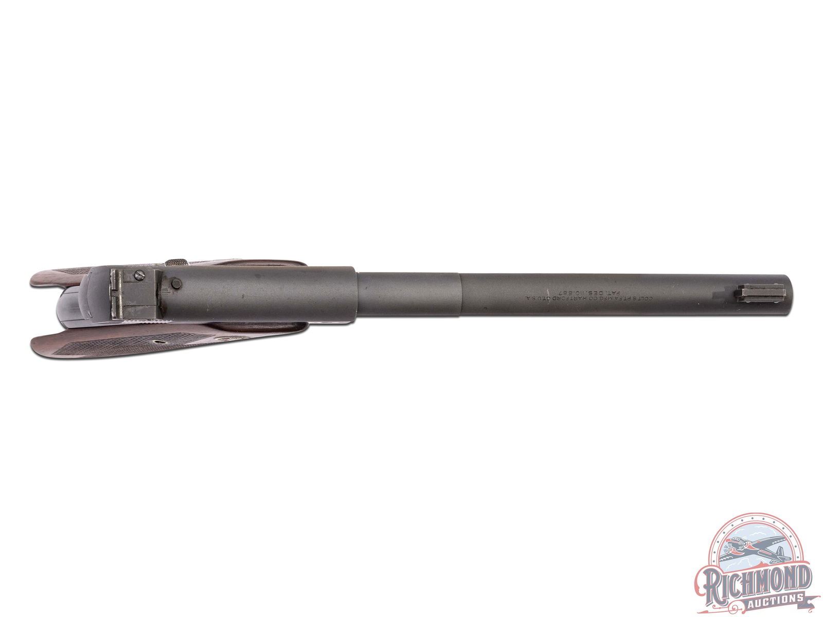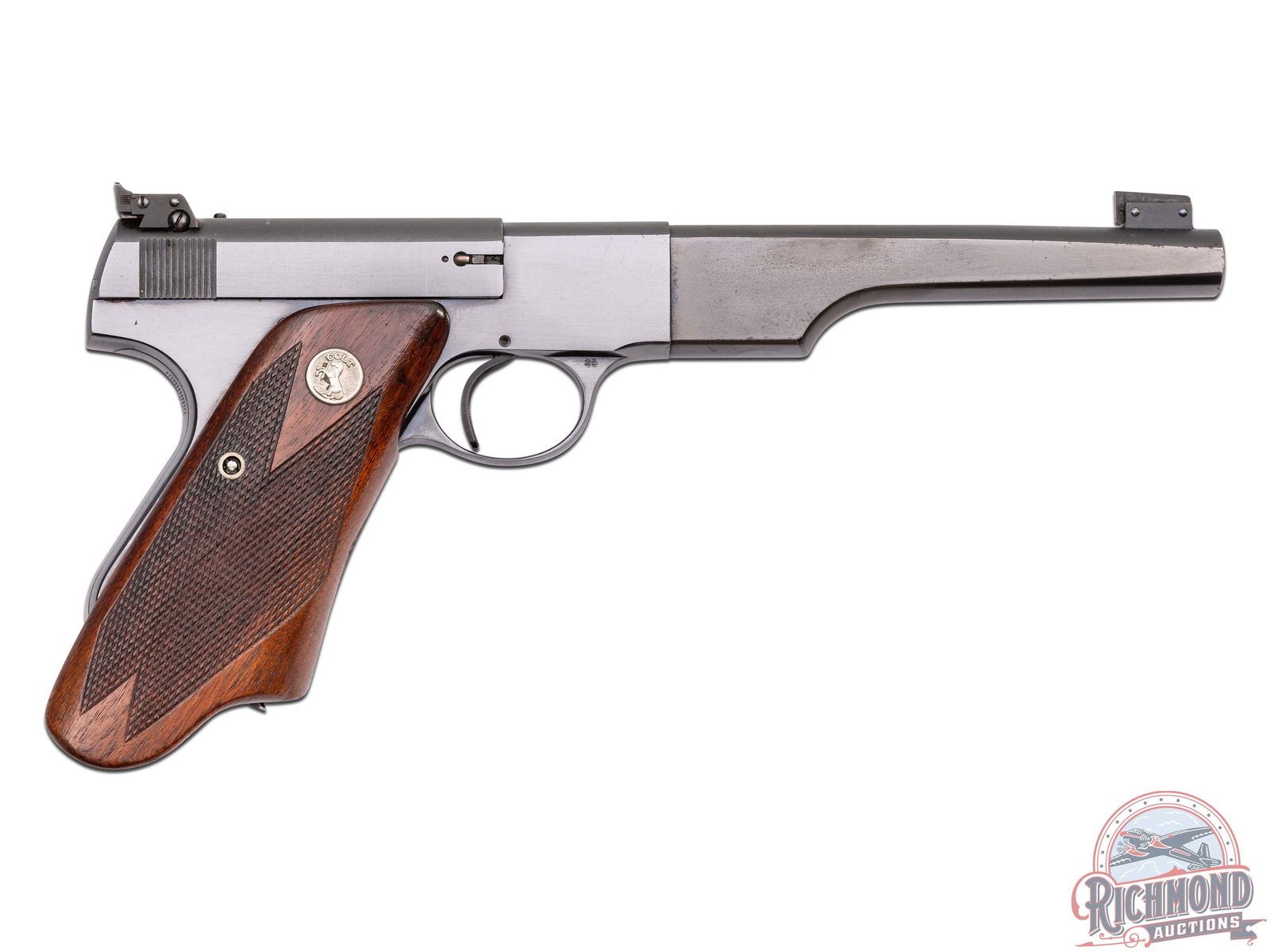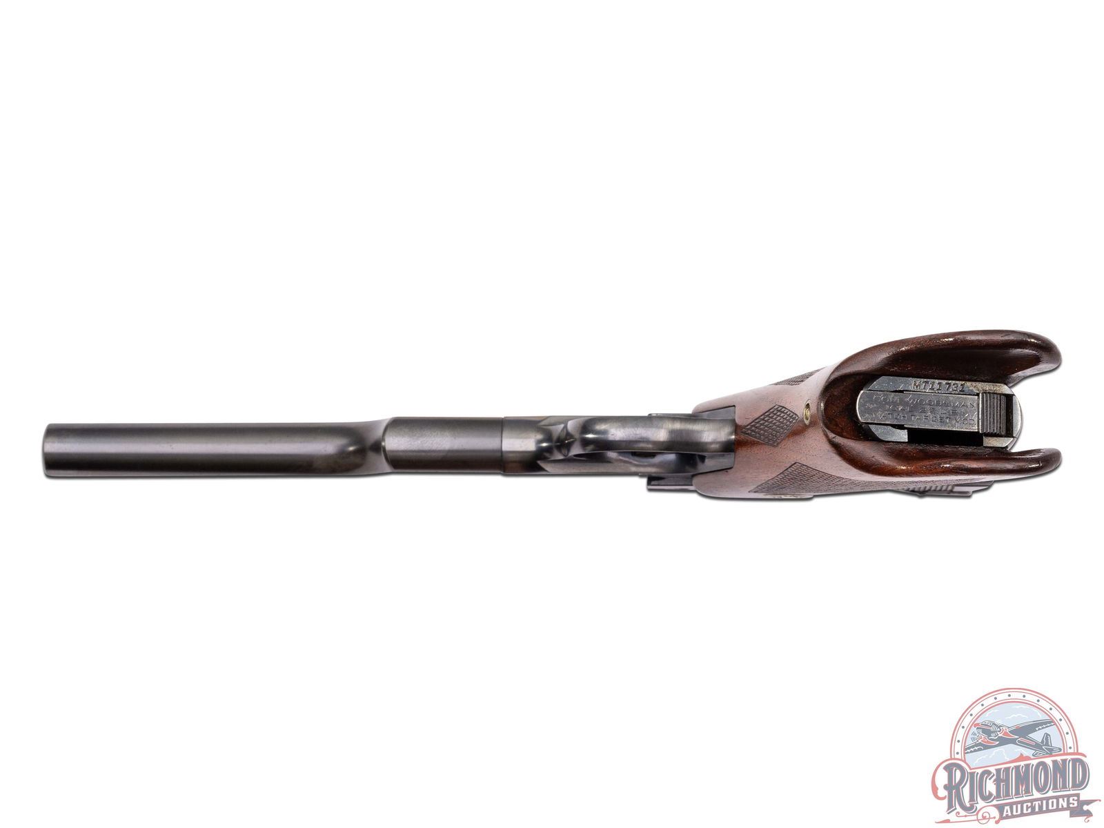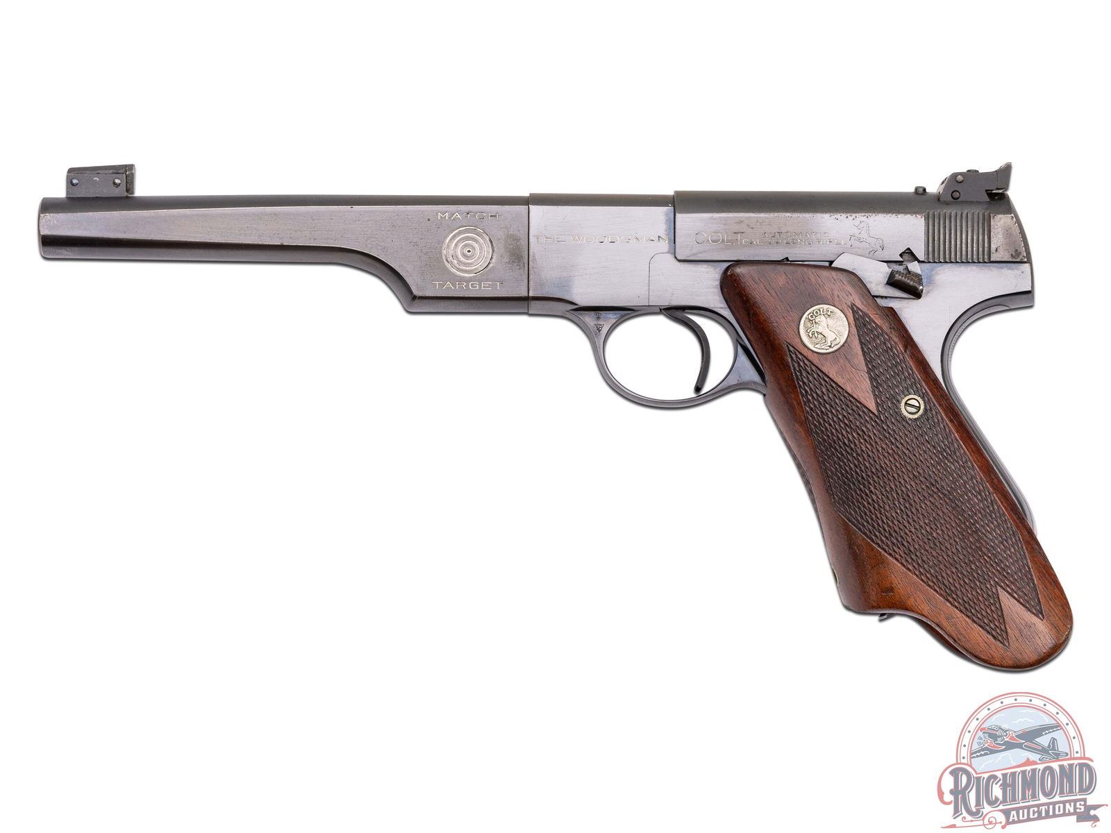 Manufactured in 1941, a nice original example of the first series Match Target. This pistol features a 6-5/8" heavy barrel with rear fully adjustable notch sight and adjustable front blade. Top of the barrel is stamped with the two-line Colt address. Blued finish with white highlighted stampings. Left side of the barrel is stamped "MATCH TARGET" with the iconic "bullseye" and "THE WOODSMAN". Left side of the slide is stamped "COLT / AUTOMATIC / CAL. 22 LONG RIFLE" with the Rampant Colt. Trigger guard is stamped with the VP proof mark and letter "T". Fitted with original Colt factory one-piece walnut wrap-around Elephant Ear grips with silver tone Colt medallions. Includes original factory 10-round magazine, stamped on the base "COLT WOODSMAN / CAL 22 LR / MATCH TARGET MOD". Hard to find all original pistol! CALIBER: 22LR. S/N: MT11731. FFL STATUS: Curio & Relic.