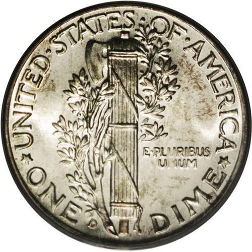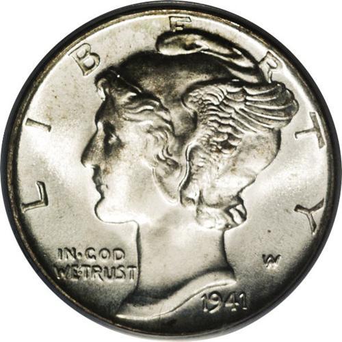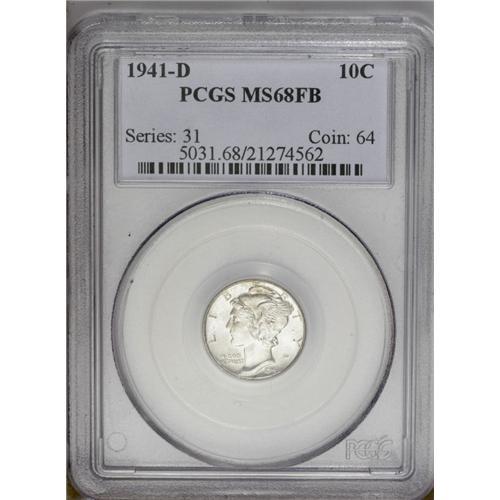 <B>1941-D<10C> MS68 Full Bands NGC.</B></I> Faint silver-gray patina is draped over both sides with a blush of russet color interspersed in the fields on each side. The peripheral areas are equally as sharp as the central highpoints, and the latter include desirable Full Bands definition on the reverse. An unimprovable coin with regard to surface preservation and striking quality. Population: 15 in 68, 0 finer (4/06).