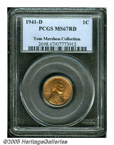 <B>1941-D<1C> MS67 Red PCGS.</B></I> A lustrous sunset-gold Superb Gem that has a bold strike and undisturbed surfaces. None have been graded higher by either major service.<BR><I>From The Tom Mershon #2 All-Time PCGS Registry Set of Lincoln Wheat Cents.</B></I>