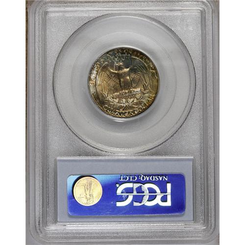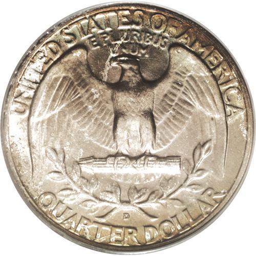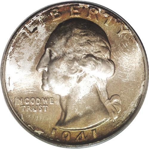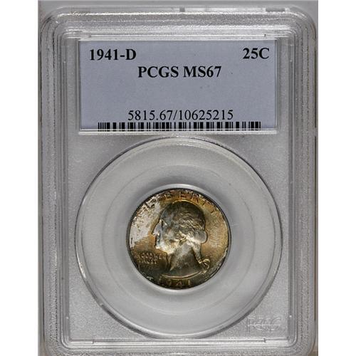 <B>1941-D<25C> MS67 PCGS.</B></I> An issue that is always in demand from MS65 and higher, with few examples found at the Superb Gem level. This coin offers superlative colors in a palette ranging from sand through jade-green, auburn, magenta, and russet, with a dollop of canary-yellow added to the reverse. Despite the moderately intense color, radiant cartwheel luster bursts forth. A nice one, and at the top of certified examples, save for a single piece finer at NGC. Population: 13 in 67, 0 finer (6/06).
