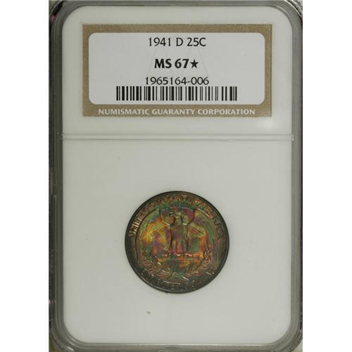 1941-D 25C MS67 S NGC. Highly lustrous surfaces exhib