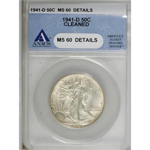 <B>1941-D 50C --Cleaned--ANACS. MS60 Details.</B></I> NGC Census: (1/4223). PCGS Population (6/7048). Mintage: 11,248,400. Numismedia Wsl. Price for NGC/PCGS coin in MS60: $30. (#6612)<BR><BR><B>Coin Engraver:</B> Adolph A. Weinman<BR><BR><b>Shipping:</b> Coins & Currency (<a target="_blank" href="http://www.heritageauctions.com/common/shipping.php">view shipping information</a>)
