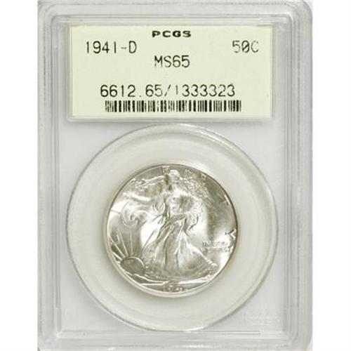 <B>1941-D 50C MS65 PCGS.</B></I> PCGS Population (3097/1293). NGC Census: (1741/1156). Mintage: 11,248,400. Numismedia Wsl. Price for NGC/PCGS coin in MS65: $175. (#6612)<BR><BR><B>Coin Engraver:</B> Adolph A. Weinman<BR><BR><b>Shipping:</b> Coins & Currency (<a target="_blank" href="http://www.heritageauctions.com/common/shipping.php">view shipping information</a>)