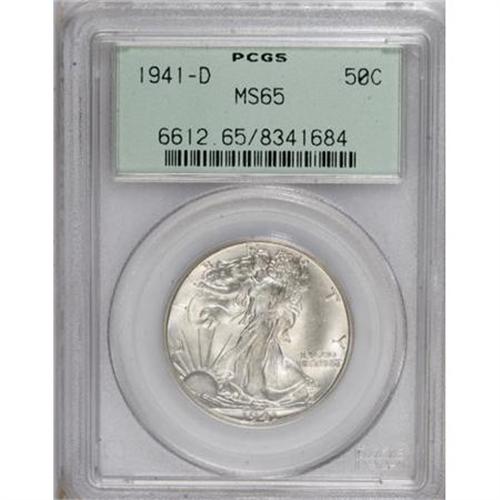 <B>1941-D 50C MS65 PCGS.</B></I> PCGS Population (3099/1295). NGC Census: (1741/1156). Mintage: 11,248,400. Numismedia Wsl. Price for NGC/PCGS coin in MS65: $175. (#6612)<BR><BR><B>Coin Engraver:</B> Adolph A. Weinman<BR><BR><b>Shipping:</b> Coins & Currency (<a target="_blank" href="http://www.heritageauctions.com/common/shipping.php">view shipping information</a>)