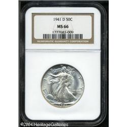 1941-D 50C MS66 NGC. Bright lustrous surfaces are <B>1941-D 50C MS66 NGC.</B></I> Bright lustrous surfaces are essentially untoned, and display sharply impressed devices. Well preserved on both sides. <BR><BR><B>Important notice:</B> Heritage usually auctions material at the rate of 200-250 lots per hour. On some occasions eBay Live bid software or the Internet may not be able to keep up with the pace of the auction. We recommend placing a realistic absentee bid now as insurance to avoid disappointment. Occasionally the auctioneer may eliminate or reject an eBay Live bid, and the auctioneer may also reopen a lot after the close of the eBay live bidding (usually because we missed an audience bid), and may reject your bid even if it shows you as the winning bidder. By bidding via eBay Live, you agree that Heritage may award the lot to another bidder at its sole discretion under the circumstances described above or any other reasonable circumstances. Since eBay bids are not shown to us until we open the lot on the floor, we treat those bids just like floor bids. In most cases the floor responds before the eBay bid is presented to us, due to Internet lag time, so for consistency we have made it a policy that floor bids are always considered first over tie eBay live bids. Also please note that all Heritage lots purchased through eBay Live carry a 20% Buyer's Premium. Please make sure you read the Terms and Conditions before you bid. This lot is being auctioned in conjunction with a live floor auction by Heritage Galleries & Auctioneers. All final auction and invoice information will be supplied by Heritage Galleries & Auctioneers, and all other information should be considered preliminary. Lot:6212