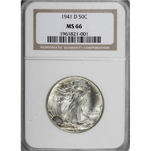 <B>1941-D 50C MS66 NGC.</B></I> NGC Census: (1033/121). PCGS Population (1166/118). Mintage: 11,248,400. Numismedia Wsl. Price for NGC/PCGS coin in MS66: $210. (#6612)<BR><BR><B>Coin Engraver:</B> Adolph A. Weinman<BR><BR><b>Shipping:</b> Coins & Currency (<a target="_blank" href="http://www.heritageauctions.com/common/shipping.php">view shipping information</a>)