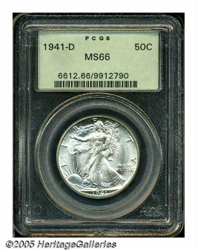 <B>1941-D<50C> MS66 PCGS.</B></I> Brilliant surfaces display dazzling luster and adequately struck design elements. A few minute marks around Liberty's left breast and hand are mentioned for accuracy.