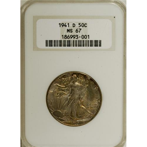 <B>1941-D 50C MS67 NGC.</B></I> Softly lustrous beneath rich patina that has subtle grades of red, orange, and green. This suitably struck piece is tied for the finest graded by NGC (2/07).<BR><BR><b>Shipping:</b> Coins & Currency (<a target="_blank" href="http://www.heritageauctions.com/common/shipping.php">view shipping information</a>)