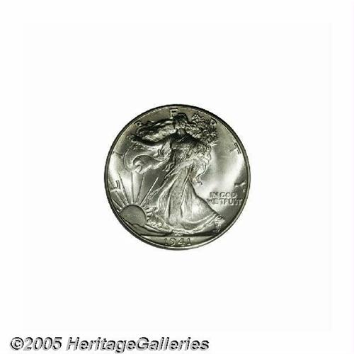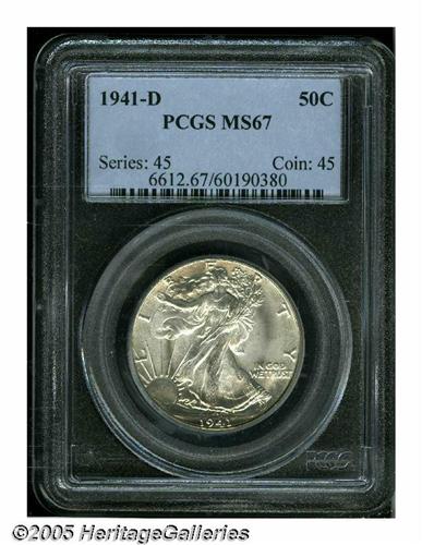 <B>1941-D<50C> MS67 PCGS.</B></I> Among all of the various different Walking Liberty Half Dollar issues of the 1940s, this is one of the more plentiful branch mint issues. Despite the availability of this date, only one finer example has been certified. This example is sharply struck and highly lustrous with fully brilliant silver surfaces. Population: 100 in 67, 1 finer (6/05).<BR><I>From The Robert Moreno Collection.</B></I>