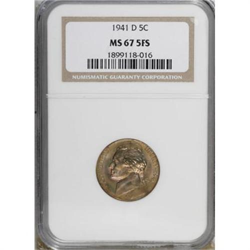 <B>1941-D 5C MS67 Five Full Steps NGC.</B></I> NGC Census: (23/0). PCGS Population (128/1). Mintage: 53,432,000. (#84011)<BR><BR><b>Shipping:</b> Coins & Currency (<a target="_blank" href="http://www.heritageauctions.com/common/shipping.php">view shipping information</a>)