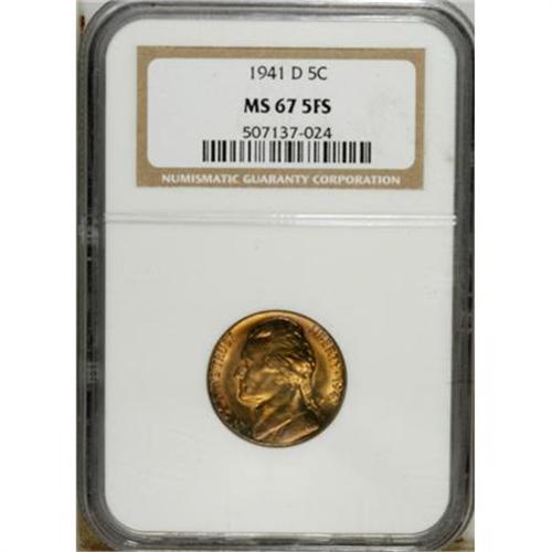 <B>1941-D 5C MS67 Full Steps NGC.</B></I> NGC Census: (23/0). PCGS Population (128/1). (#84011)<BR><BR><b>Shipping:</b> Coins & Currency (<a target="_blank" href="http://www.heritageauctions.com/common/shipping.php">view shipping information</a>)