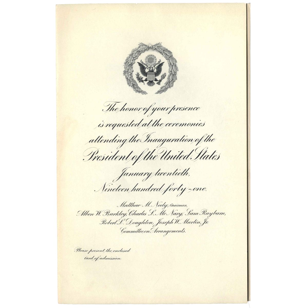 Invitation for the 1941 inauguration ceremony of Franklin D. Roosevelt. Card style invitation includes loose insert engraved photographs of FDR and Vice President Henry Wallace with tissue guards. All measure 6.25'' x 10''. Also includes original envelope ''No. 2747'' for ''Inaugural Platform B.'' The 1941 inauguration ceremony marked the only time in the United States' history where a President was elected to a third term in office. Near fine condition.
