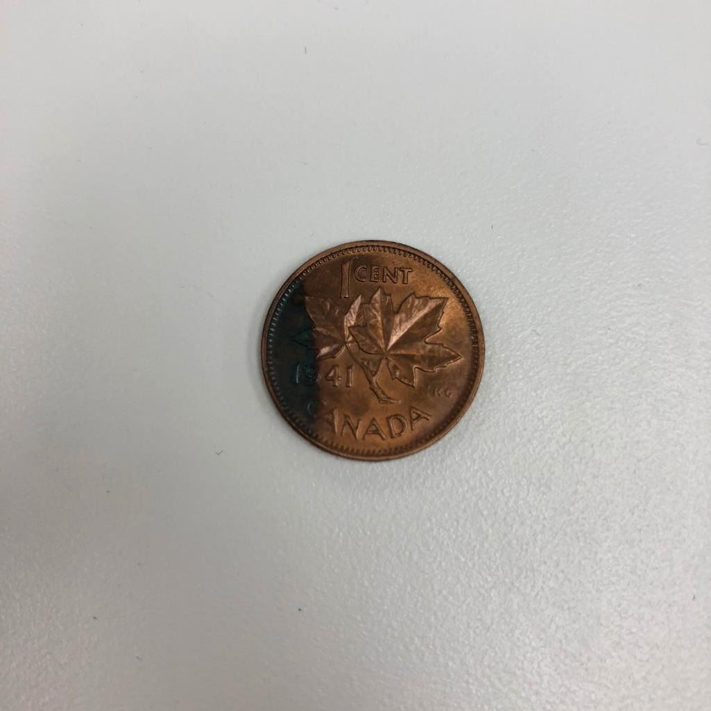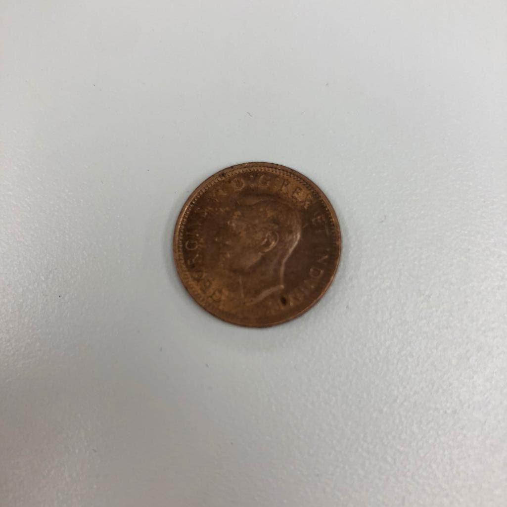 Obverse A portrait of King George VI facing left, surrounded with the inscription "GEORGIVS VI D:G:REX ET IND:IMP:" meaning: George V, by the grace of God, the King and Emperor of India Lettering: GEORGIVS VI D:G:REX ET IND:IMP: Engraver: Thomas Humphrey Paget Reverse A maple leaf twig is surrounded with the face value and the inscription "CANADA". Lettering: 1 CENT 1937 CANADA Engraver: George Kruger Gray Specifications CountryCanada Type: Standard circulation coin Years: 1937-1947 Value: 1 Cent (0.01 CAD) Composition: Bronze Weight: 3.24 g Diameter: 19.05 mm Thickness: 1.65 mm Shape: Round
