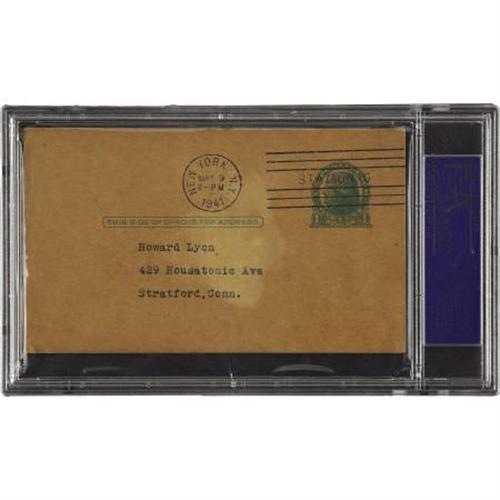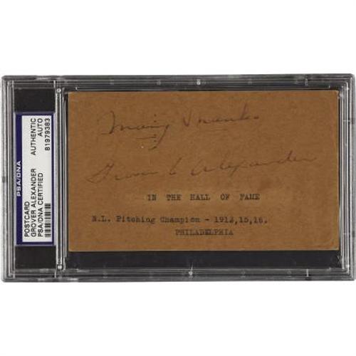 <B>1941 Grover Cleveland Alexander Signed Government Postcard.</B></I> Had he not lost a season and a half to military service during the first World War, Old Pete almost certainly would have joined Cy Young and Walter Johnson as the only men in Major League history to tally four hundred victories. Still the bronze medalist in that event, the troubled hurler is remembered with this 7/10 "Grover C. Alexander" autograph to a fan penned beneath a "Many Thanks" sentiment. One of many government postcards from the collection of young Howard Lyon presented within this auction. Encapsulated by PSA/DNA for protection and unquestioned authenticity.<BR><BR><b>Shipping:</b> Flat Material, Small (<a target="_blank" href="http://www.heritageauctions.com/common/shipping.php">view shipping information</a>)