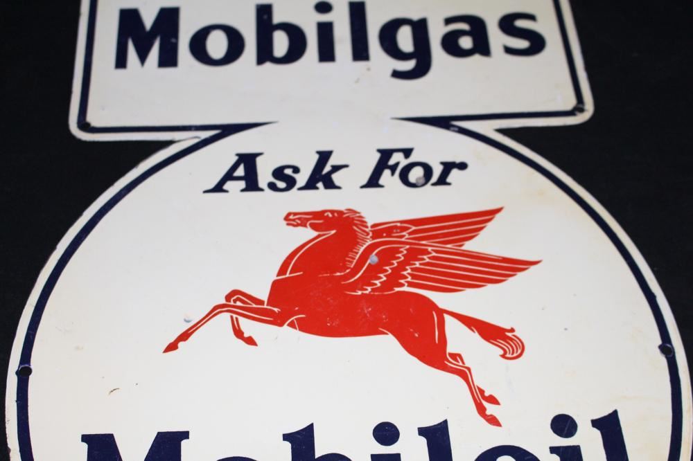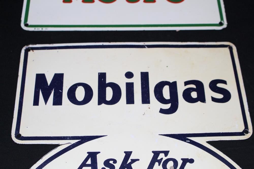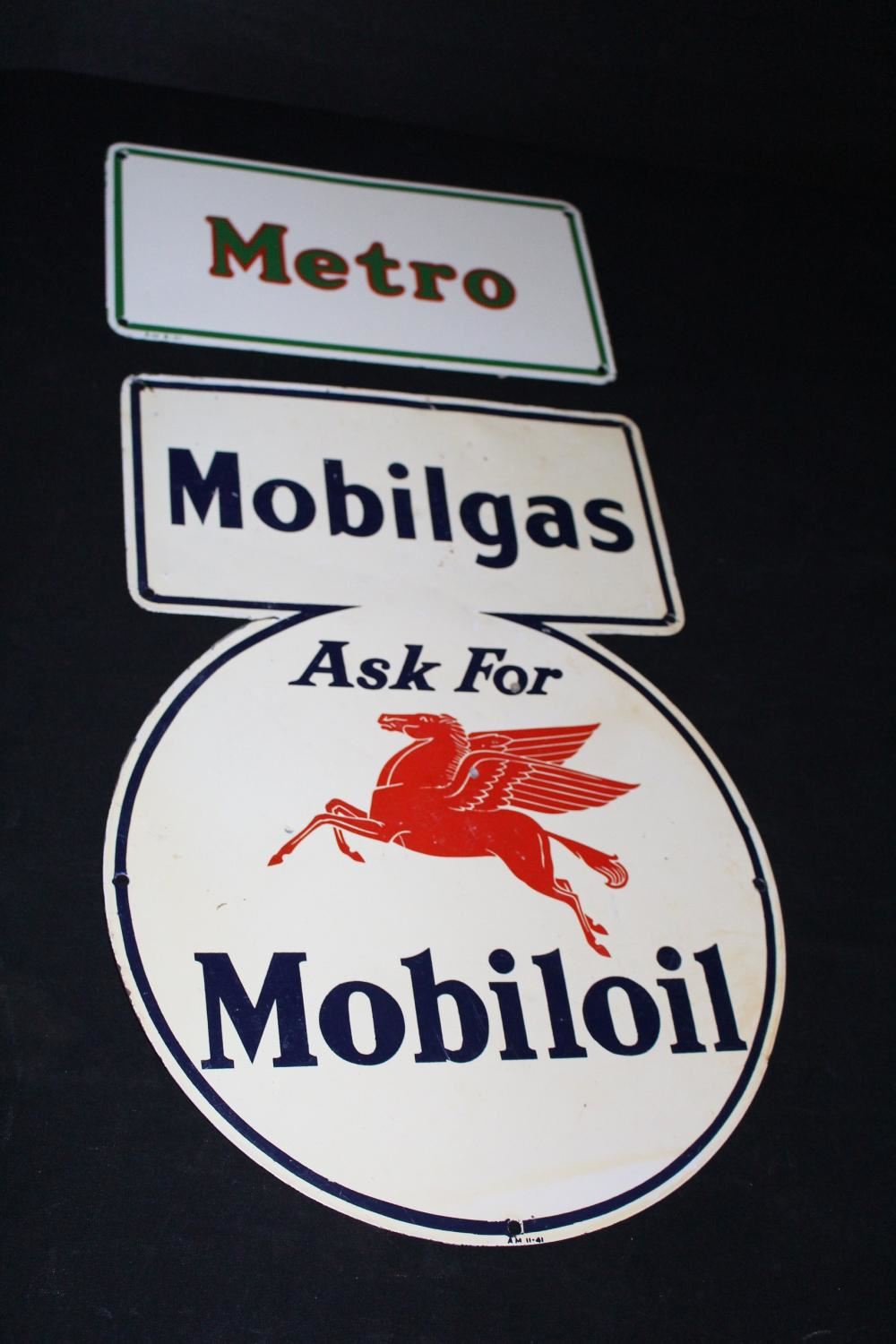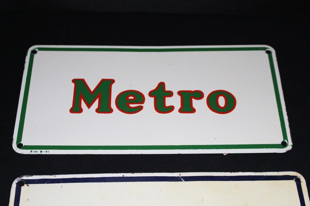 1 SIDED TIN SIGNS. METRO IS NOS, 10 1/4 X 5 1/4. MOBILGAS HAS BEEN SUED AND SHOWS WEAR AND DINGS, 15 3/4 X 11 3/8. APPROXIMATE SHIPPING COST $15 TO $20. THIS ITEM IS GUARANTEED TO BE OLD AND ORIGINAL.