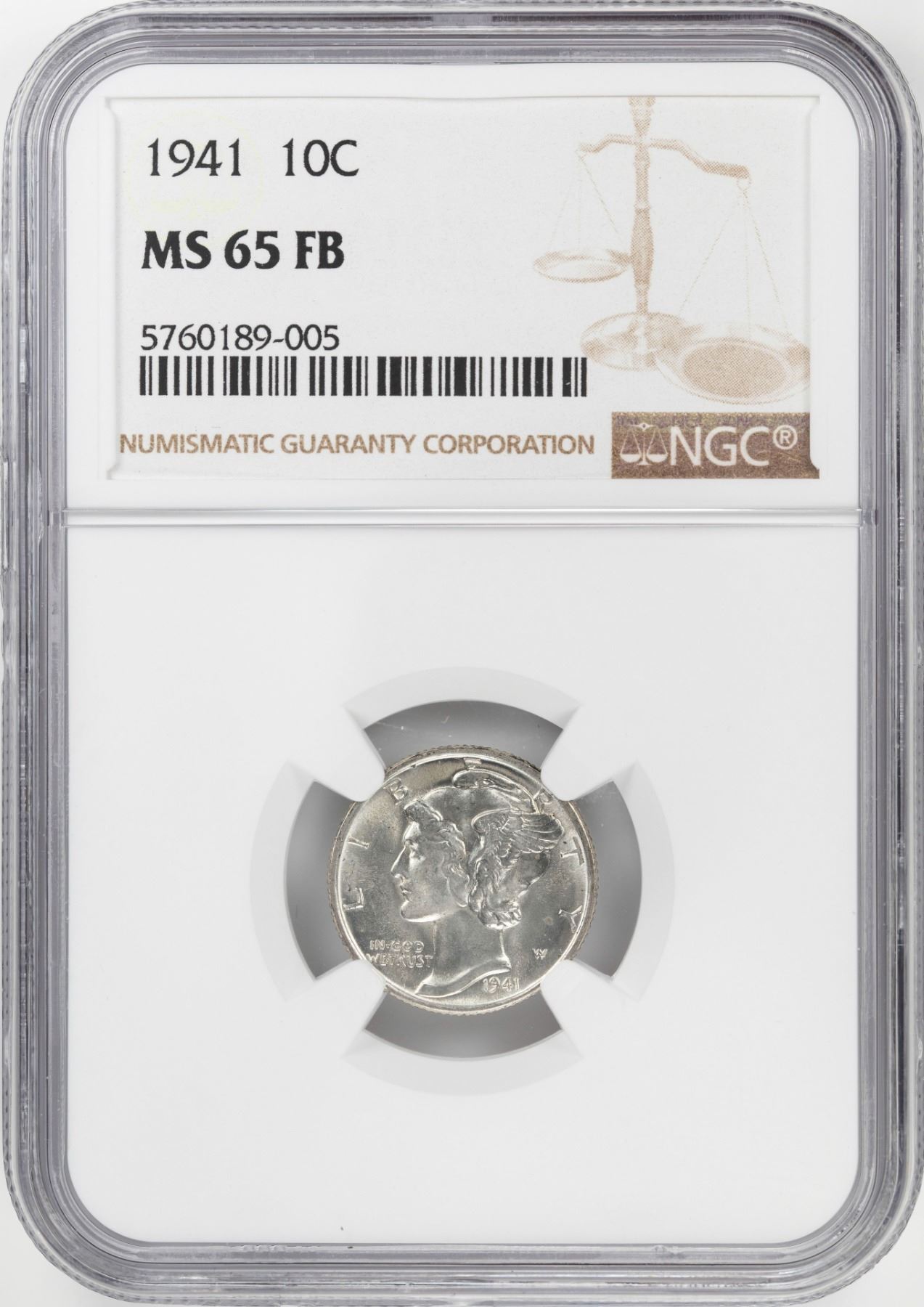 One 1941 Mercury Dime Coin NGC MS65FB.
