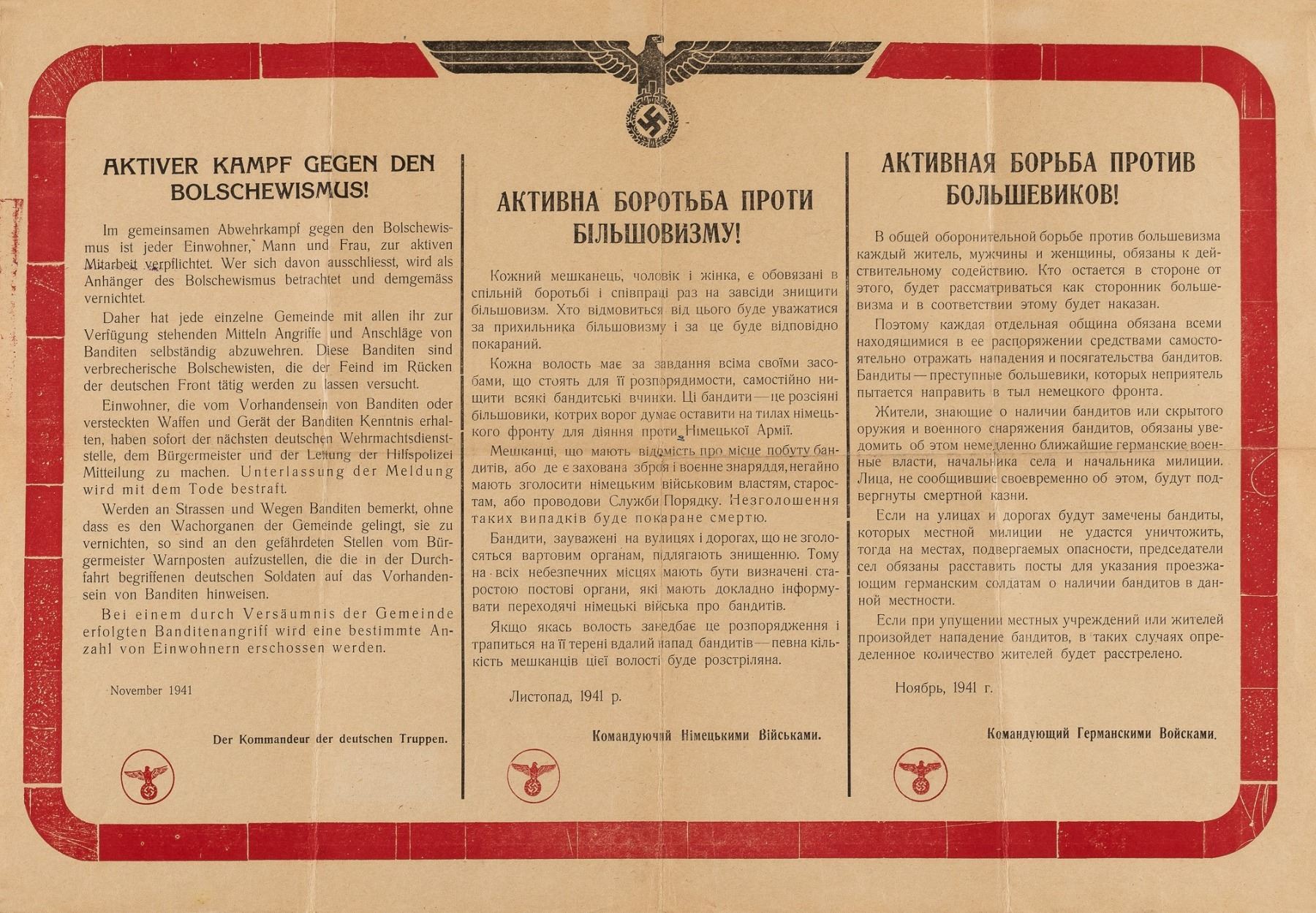 November 1941 German screen printed broadside calling for the active fight against Bolshevik partisans in occupied Ukraine. The broadside reads in parts 'Fight Against Bolshevism! In the fight against Bolshevism every man and woman is obliged to cooperate. Anyone who excludes himself is considered a follower of Bolshevism and will be annihilated. These bandits are criminal Bolsheviks whom the enemy is trying to mobilize behind the German front. Residents who become aware of...bandits or hidden weapons...must immediately inform the German Wehrmacht...Failure to report is punishable by death. If bandits are noticed on the streets...the mayor is to set up warning posts to warn the German soldiers...A certain number of residents will be shot in a bandit attack caused by negligence. November 1941 The commander of the German troops.' German Reichs eagle at the top center clutching a mobile swastika and a red printed border, the text printed in German, Ukrainian, and Russian. 17.75 x 25.5 inches, several folds.