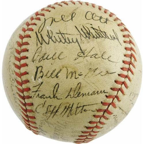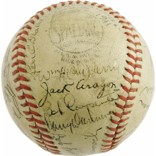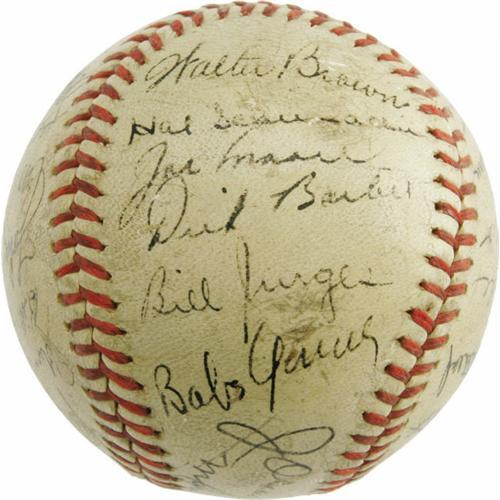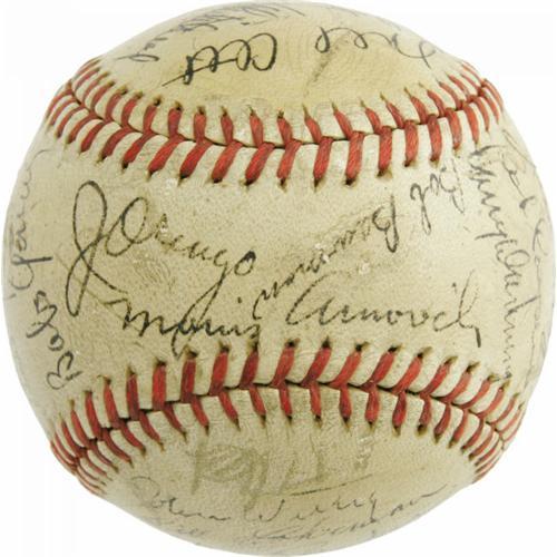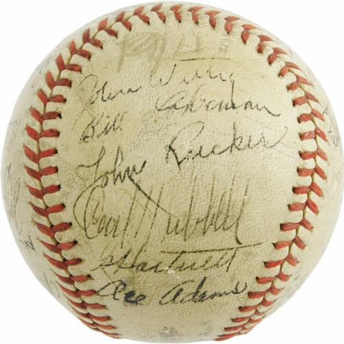 <B>1941 New York Giants Team Signed Baseballs.</B></I> Six letters spelled out in 10/10 black ink on the side panel of this ONL (Frick) ball make this one a collector's dream, as you'll have to search far and wide to find a superior example of the great Mel Ott's autograph. He's joined by twenty-five of his Polo Grounds pals, notably fellow Hall of Famers Hubbell and Terry, with Schumacher, Whitehead, Rucker, Jurges, Bartell and more. The 500 Home Run Club slugger is happily the best of the bunch, though the average of the balance of autographs is still an impressive 7/10 to 8/10. The ball shows even toning and a few minor nicks and scuffs that do not have any noteworthy effect upon the autographs. <I>LOA from PSA/DNA.</B></I> <BR><BR><B>Important notice:</B> Heritage usually auctions material at the rate of 200-250 lots per hour. On some occasions eBay Live bid software or the Internet may not be able to keep up with the pace of the auction. We recommend placing a realistic absentee bid now as insurance to avoid disappointment. Occasionally the auctioneer may eliminate or reject an eBay Live bid, and the auctioneer may also reopen a lot after the close of the eBay live bidding (usually because we missed an audience bid), and may reject your bid even if it shows you as the winning bidder. By bidding via eBay Live, you agree that Heritage may award the lot to another bidder at its sole discretion under the circumstances described above or any other reasonable circumstances. Since eBay bids are not shown to us until we open the lot on the floor, we treat those bids just like floor bids. In most cases the floor responds before the eBay bid is presented to us, due to Internet lag time, so for consistency we have made it a policy that floor bids are always considered first over tie eBay live bids. Also please note that all Heritage lots purchased through eBay Live carry a 22.5% Buyer's Premium. Please make sure you read the Terms and Conditions before you bid. This lot is being auctioned in conjunction with a live floor auction by Heritage Galleries & Auctioneers. All final auction and invoice information will be supplied by Heritage Galleries & Auctioneers, and all other information should be considered preliminary. Lot:19393 <BR><BR><B>Winning Notification and Billing:</B> After the FINAL session in this auction is complete, Heritage will send e-mail and snail mail invoices. This process normally takes several days. All final auction and invoice information will be supplied by Heritage Galleries & Auctioneers, and all other information should be considered preliminary. <BR><BR>This auction will be conducted on a live auction floor and over the Internet through eBay Live. If you choose to place an absentee bid, please take a moment to <font color='#0000ff'><u><a href='http://pages.ebay.com/liveauctions/help/before/laabsentee.html'>learn how eBay Live absentee bidding works</a></u></font><font color='#000000'>