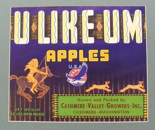 1941 Original U LIKE UM Apple Crate Label. Visual measures approx. 8 1/2'' x 10''. Buyers Pay Actual Shipping and Handling Charges(see terms and conditions for more information).