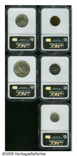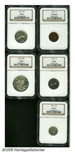 <B>1941 Proof Set PR64 to PR65 NGC.</B></I> The set includes: <B>Cent<1C> PR64 Red,</B></I> rich orange-red color, well struck, nearly carbon-free; <B>Nickel PR65,</B></I> light apricot color, beautifully preserved, impressive eye appeal, the steps are razor sharp; <B>Dime PR64,</B></I> a few faint slide marks on the obverse, a needle-sharp strike, a hint of yellow-gold and cream colors; <B>Quarter PR64,</B></I> carefully preserved, light tan and pearl hues, minor striking softness on the peripheral legends; and a <B>Half Dollar PR64,</B></I> a few wispy hairlines in the right obverse field, no AW initials, intricately struck, light gold toning.