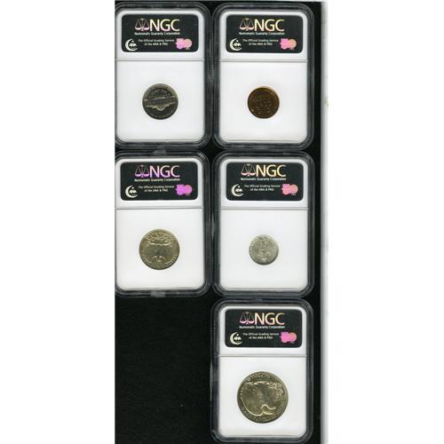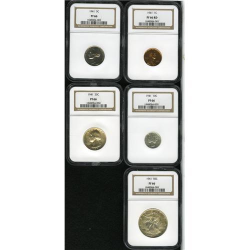 <B>1941 Proof Set PR66 NGC.</B></I> The set includes: <B>cent PR66 Red,</B></I> bright copper-orange surfaces with full mint red; <B>nickel PR66,</B></I> milky patina with sharp steps; <B>dime PR66,</B></I> nearly brilliant with an exquisite strike; <B>quarter PR66,</B></I> partial tan toning with heavy die polish; <B>half dollar PR66,</B></I> tan patina overall, the designer's initials are very faint.<BR><I>From The Redfjord Collection.</B></I>