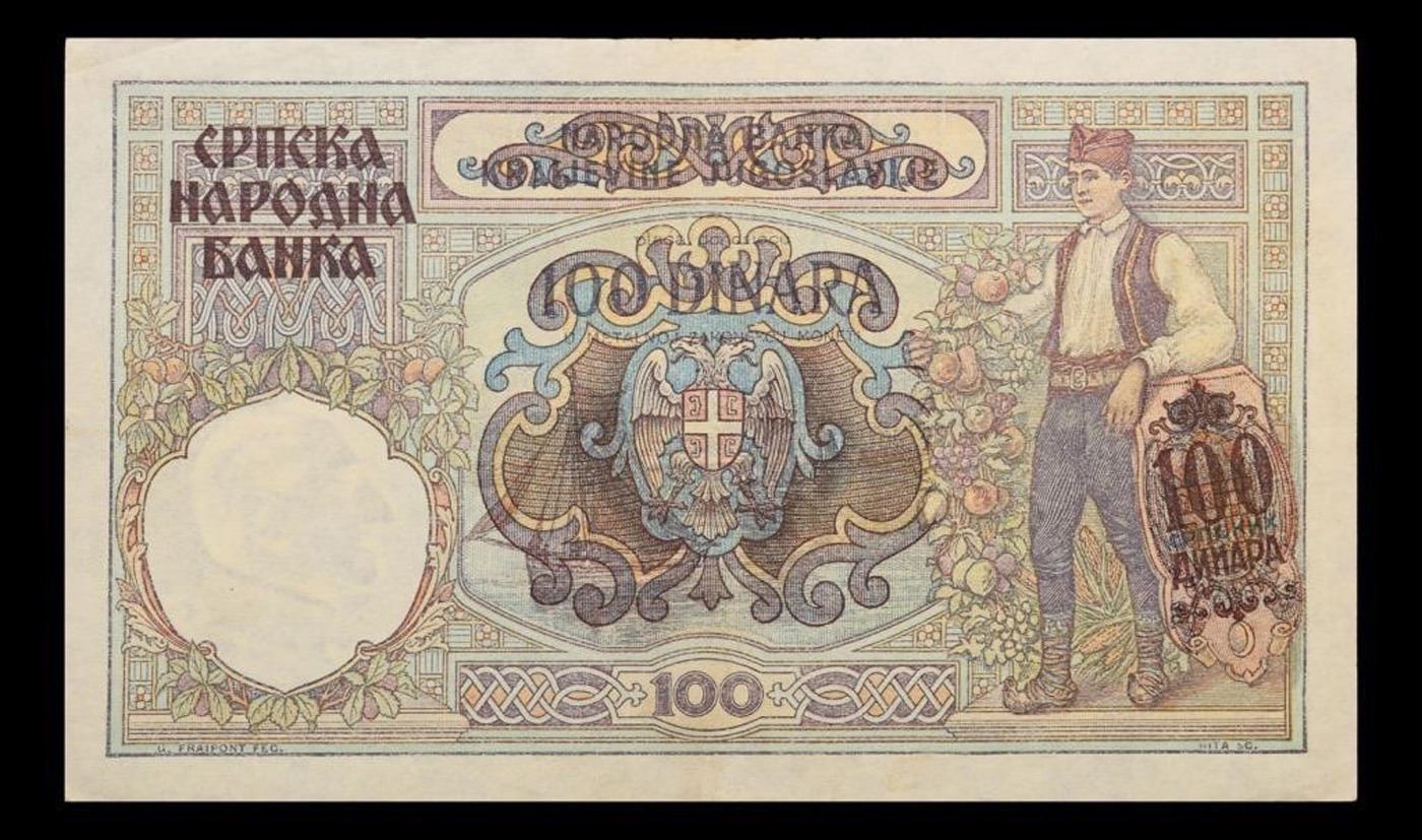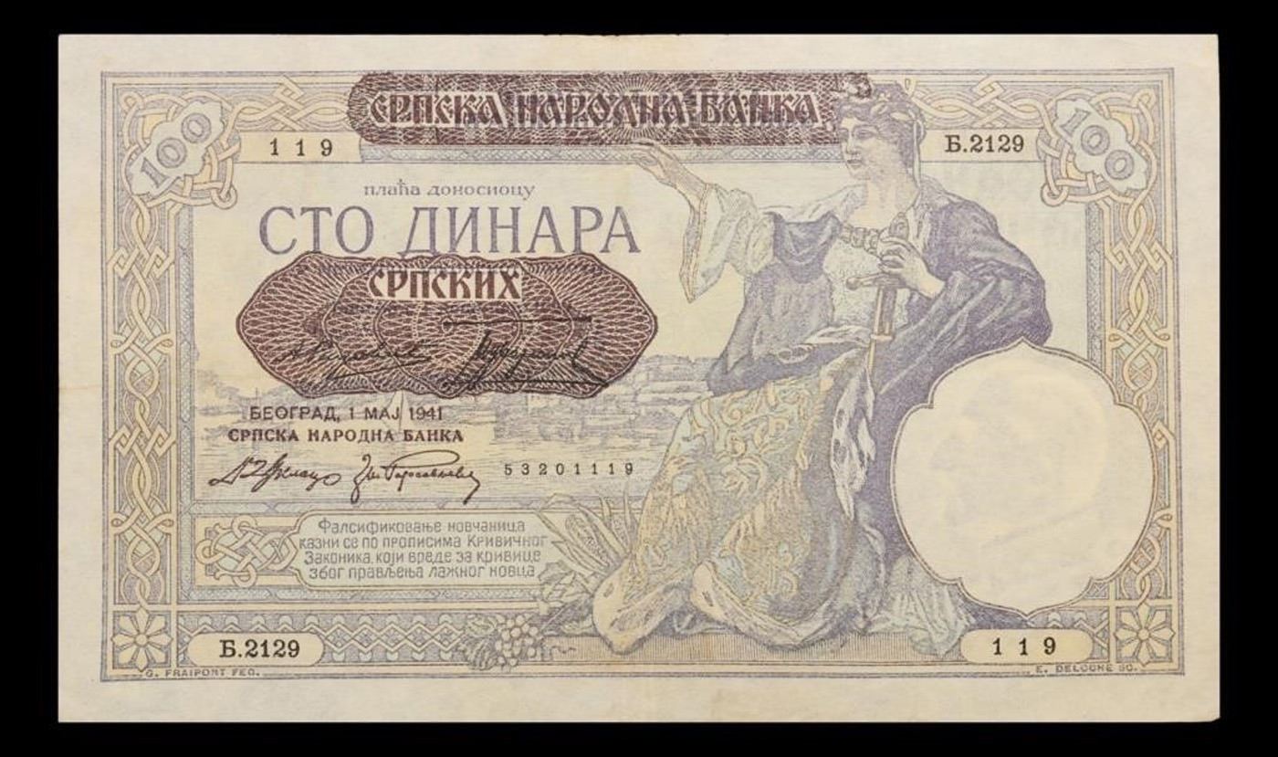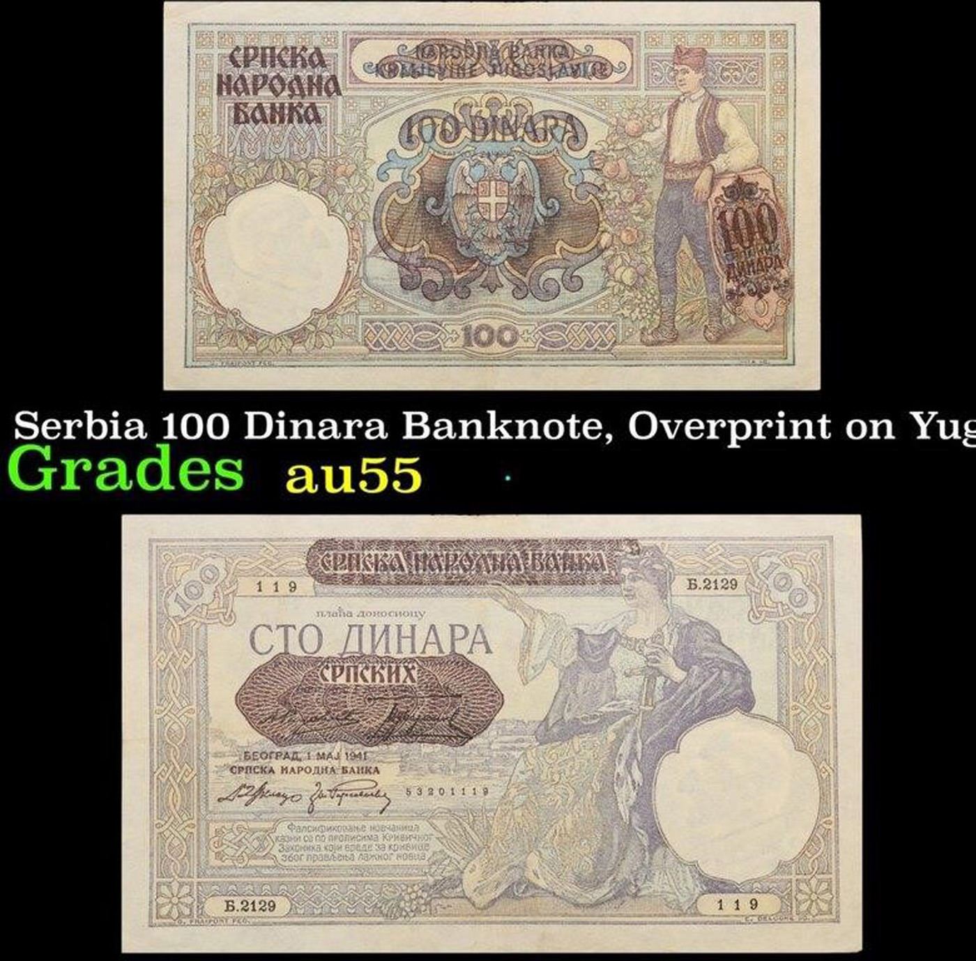 1941 Provisional Issue Serbia 100 Dinara Banknote, Overprint on Yugoslavia P#27 Note P# 23 Grades Ch