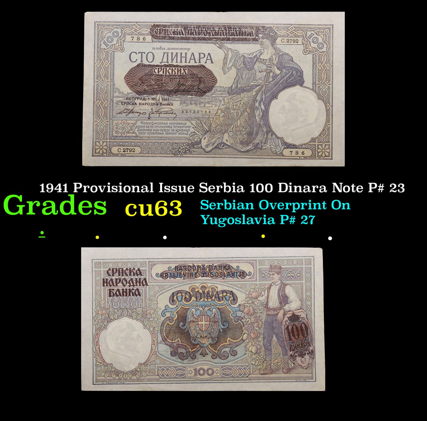 1941 Provisional Issue Serbia 100 Dinara Note P# 23 Grades Select CU.