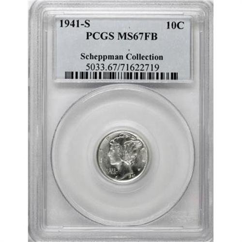 <B>1941-S 10C MS67 Full Bands PCGS.</B></I> A minimally toned S-mint survivor that offers exquisite detail and delightful mint bloom. Both sides showcase impressive preservation. PCGS has graded just three finer Full Bands coins (12/07).<BR><I>From The Scheppman Collection, #4 PCGS Registry of Full Band Mercury Dimes.</B></I><BR><BR><B>Coin Engraver:</B> Adolph A. Weinman<BR><BR><b>Shipping:</b> Coins & Currency (<a target="_blank" href="http://www.heritageauctions.com/common/shipping.php">view shipping information</a>)