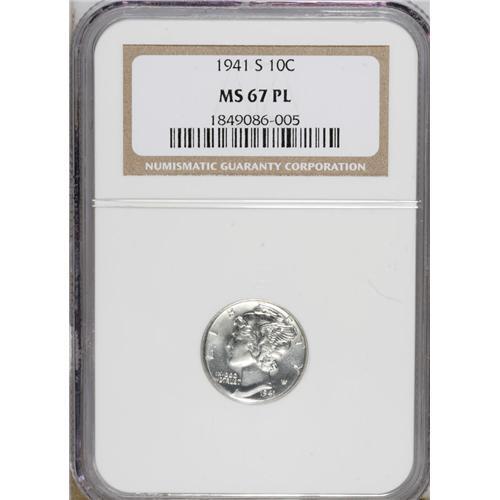 <B>1941-S 10C MS67 Prooflike NGC.</B></I> NGC Census: (345/5). PCGS Population (86/1). Mintage: 43,090,000. Numismedia Wsl. Price: $124. (#5032)<BR><BR><b>Shipping:</b> Coins & Currency (<a target="_blank" href="http://www.heritageauctions.com/common/shipping.php">view shipping information</a>)
