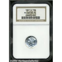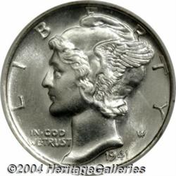 <B>1941-S<10C> MS68 Full Bands Prooflike NGC.</B></I> Small S mintmark. The centers are needle-sharp, while the tops of a few of the peripheral legends do not have complete definition. This brilliant and seemingly immaculate Superb Gem has unusually reflective fields for the issue. <BR><BR><B>Important notice:</B> Heritage usually auctions material at the rate of 200-250 lots per hour. On some occasions eBay Live bid software or the Internet may not be able to keep up with the pace of the auction. We recommend placing a realistic absentee bid now as insurance to avoid disappointment. Occasionally the auctioneer may eliminate or reject an eBay Live bid, and the auctioneer may also reopen a lot after the close of the eBay live bidding (usually because we missed an audience bid), and may reject your bid even if it shows you as the winning bidder. By bidding via eBay Live, you agree that Heritage may award the lot to another bidder at its sole discretion under the circumstances described above or any other reasonable circumstances. Since eBay bids are not shown to us until we open the lot on the floor, we treat those bids just like floor bids. In most cases the floor responds before the eBay bid is presented to us, due to Internet lag time, so for consistency we have made it a policy that floor bids are always considered first over tie eBay live bids. Also please note that all Heritage lots purchased through eBay Live carry a 20% Buyer's Premium. Please make sure you read the Terms and Conditions before you bid. </span></font></tr></table></td></tr></table>