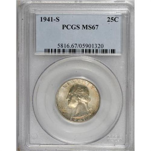<B>1941-S 25C MS67 PCGS.</B></I> Soft luster swirls beneath delicate layers of intermittent gold, bronze, and cloud-gray patina. This well struck and lovely Superb Gem is tied for the finest certified by either NGC or PCGS (10/07).<BR><BR><B>Coin Engraver:</B> John Flanagan<BR><BR><b>Shipping:</b> Coins & Currency (<a target="_blank" href="http://www.heritageauctions.com/common/shipping.php">view shipping information</a>)