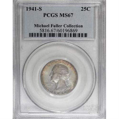 <B>1941-S 25C MS67 PCGS.</B></I> Small S. Sea-green, burnt-orange, and russet-red toning endows the borders of this satiny and immaculate Superb Gem. The eye appeal is exceptional, and the strike is precise save for minor incompleteness on some peripheral letters. Population: 30 in 67, 0 finer (8/07).<BR><I>From The Michael Fuller Collection.</B></I><BR><BR><B>Coin Engraver:</B> John Flanagan<BR><BR><b>Shipping:</b> Coins & Currency (<a target="_blank" href="http://www.heritageauctions.com/common/shipping.php">view shipping information</a>)
