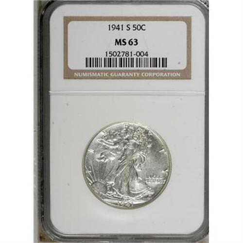 <B>1941-S 50C MS63 NGC.</B></I> NGC Census: (682/3265). PCGS Population (1295/5159). Mintage: 8,098,000. Numismedia Wsl. Price for NGC/PCGS coin in MS63: $133. (#6613)<BR><BR><B>Coin Engraver:</B> Adolph A. Weinman<BR><BR><b>Shipping:</b> Coins & Currency (<a target="_blank" href="http://www.heritageauctions.com/common/shipping.php">view shipping information</a>)