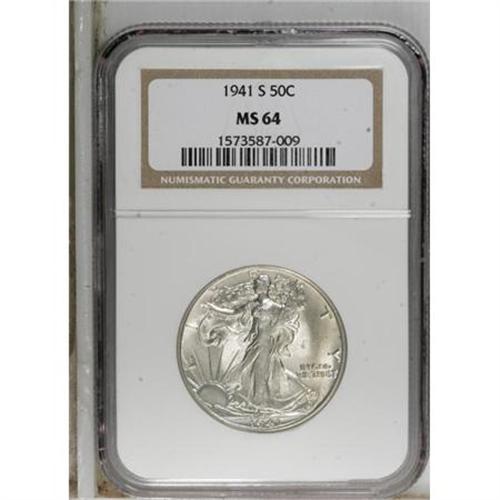 <B>1941-S 50C MS64 NGC.</B></I> NGC Census: (2273/938). PCGS Population (2875/2070). Mintage: 8,098,000. Numismedia Wsl. Price for NGC/PCGS coin in MS64: $200. (#6613)<BR><BR><b>Shipping:</b> Coins & Currency (<a target="_blank" href="http://www.heritageauctions.com/common/shipping.php">view shipping information</a>)