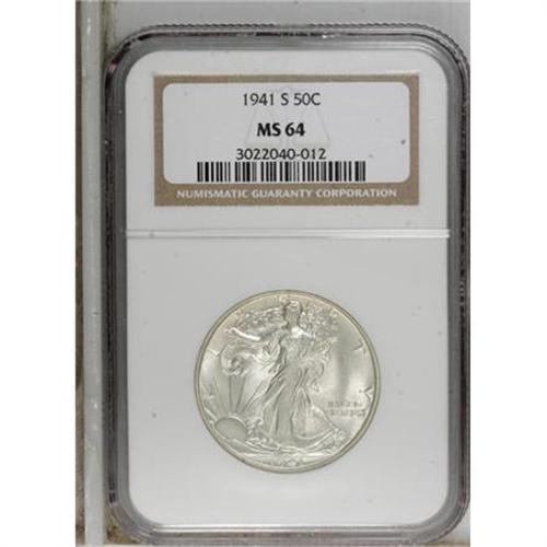 <B>1941-S 50C MS64 NGC.</B></I> NGC Census: (2273/938). PCGS Population (2875/2070). Mintage: 8,098,000. Numismedia Wsl. Price for NGC/PCGS coin in MS64: $200. (#6613)<BR><BR><b>Shipping:</b> Coins & Currency (<a target="_blank" href="http://www.heritageauctions.com/common/shipping.php">view shipping information</a>)