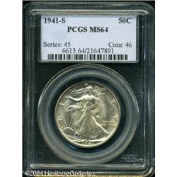 1941-S 50C MS64 PCGS. Absolutely splendid golden-t <B>1941-S 50C MS64 PCGS.</B></I> Absolutely splendid golden-tan coloration adorns the pleasingly lustrous, expertly preserved surfaces of this near-Gem, which only reveals a few tiny blemishes on the reverse. Somewhat softly struck on Liberty's hand and forward leg. <BR><BR><B>Important notice:</B> Heritage usually auctions material at the rate of 200-250 lots per hour. On some occasions eBay Live bid software or the Internet may not be able to keep up with the pace of the auction. We recommend placing a realistic absentee bid now as insurance to avoid disappointment. Occasionally the auctioneer may eliminate or reject an eBay Live bid, and the auctioneer may also reopen a lot after the close of the eBay live bidding (usually because we missed an audience bid), and may reject your bid even if it shows you as the winning bidder. By bidding via eBay Live, you agree that Heritage may award the lot to another bidder at its sole discretion under the circumstances described above or any other reasonable circumstances. Since eBay bids are not shown to us until we open the lot on the floor, we treat those bids just like floor bids. In most cases the floor responds before the eBay bid is presented to us, due to Internet lag time, so for consistency we have made it a policy that floor bids are always considered first over tie eBay live bids. Also please note that all Heritage lots purchased through eBay Live carry a 20% Buyer's Premium. Please make sure you read the Terms and Conditions before you bid. This lot is being auctioned in conjunction with a live floor auction by Heritage Galleries & Auctioneers. All final auction and invoice information will be supplied by Heritage Galleries & Auctioneers, and all other information should be considered preliminary. Lot:6217