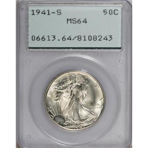 <B>1941-S 50C MS64 PCGS.</B></I> PCGS Population (2917/2143). NGC Census: (2284/954). Mintage: 8,098,000. Numismedia Wsl. Price for NGC/PCGS coin in MS64: $175. (#6613)<BR><BR><B>Coin Engraver:</B> Adolph A. Weinman<BR><BR><b>Shipping:</b> Coins & Currency (<a target="_blank" href="http://www.heritageauctions.com/common/shipping.php">view shipping information</a>)