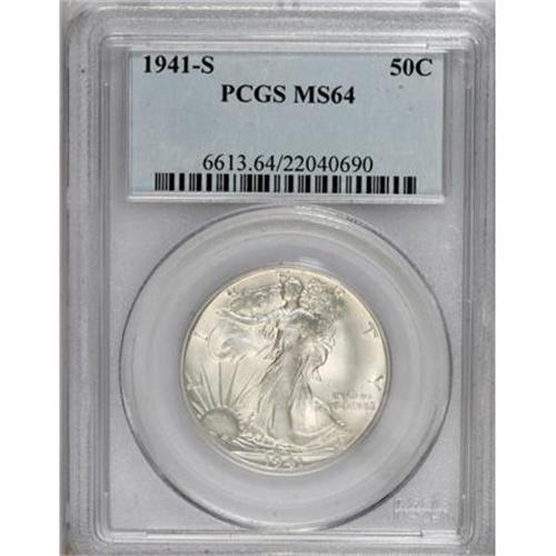 <B>1941-S 50C MS64 PCGS.</B></I> PCGS Population (2962/2167). NGC Census: (2300/958). Mintage: 8,098,000. Numismedia Wsl. Price for NGC/PCGS coin in MS64: $175. (#6613)<BR><BR><B>Coin Engraver:</B> Adolph A. Weinman<BR><BR><b>Shipping:</b> Coins & Currency (<a target="_blank" href="http://www.heritageauctions.com/common/shipping.php">view shipping information</a>)