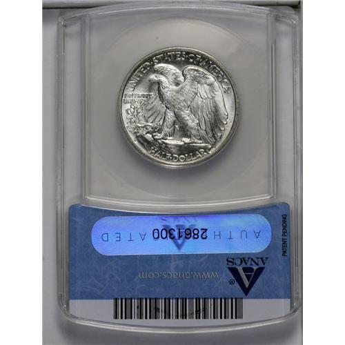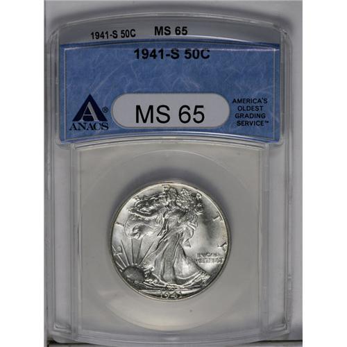<B>1941-S<50C> MS65 ANACS.</B></I> Radiant luster emanates from nearly untoned surfaces that are essentially devoid of significant blemishes. Sharply struck design elements display good (though not quite full) definition on Liberty's left thumb.