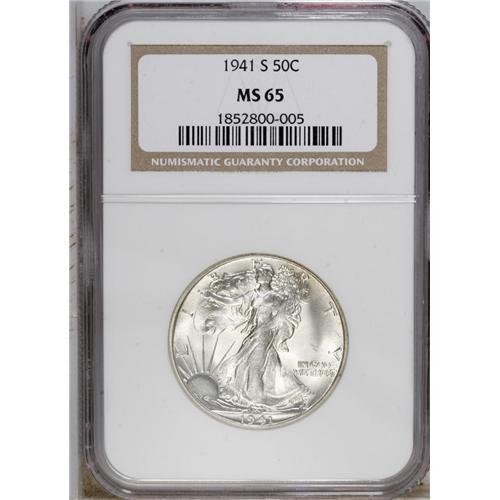 <B>1941-S 50C MS65 NGC.</B></I> A lovely short-set Gem, brilliant with the usual strike. The well-preserved surfaces have only the tiniest of marks and occasional luster breaks.<BR><BR><b>Shipping:</b> Coin/Currency (<a target="_blank" href="http://www.heritageauctions.com/common/shipping.php">view shipping information</a>)