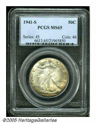 <B>1941-S<50C> MS65 PCGS.</B></I> Peripheral golden-brown and cobalt-blue patina is somewhat deeper and more extensive on the obverse. The design features are adequately struck on this semi-key example, though the area of Liberty's left hand is weak. The lustrous surfaces are seemingly devoid of significant marks.