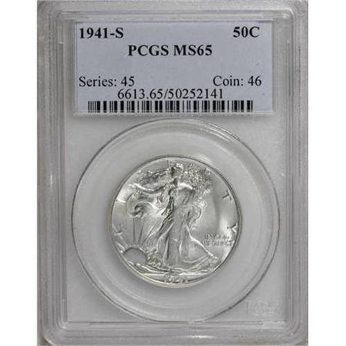 <B>1941-S 50C MS65 PCGS.</B></I> PCGS Population (1770/346). NGC Census: (777/173). Mintage: 8,098,000. Numismedia Wsl. Price for NGC/PCGS coin in MS65: $820. (#6613)<BR><BR><B>Coin Engraver:</B> Adolph A. Weinman<BR><BR><b>Shipping:</b> Coins & Currency (<a target="_blank" href="http://www.heritageauctions.com/common/shipping.php">view shipping information</a>\)