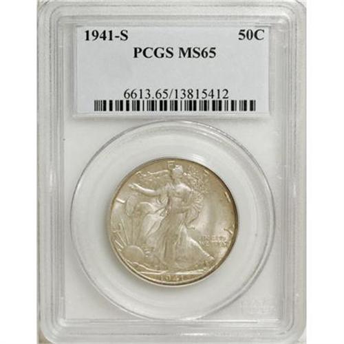 <B>1941-S 50C MS65 PCGS.</B></I> PCGS Population (1770/346). NGC Census: (777/173). Mintage: 8,098,000. Numismedia Wsl. Price for NGC/PCGS coin in MS65: $820. (#6613)<BR><BR><B>Coin Engraver:</B> Adolph A. Weinman<BR><BR><b>Shipping:</b> Coins & Currency (<a target="_blank" href="http://www.heritageauctions.com/common/shipping.php">view shipping information</a>\)