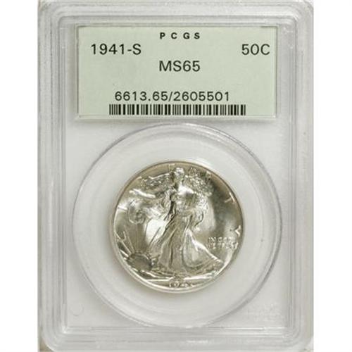 <B>1941-S 50C MS65 PCGS.</B></I> PCGS Population (1770/346). NGC Census: (777/173). Mintage: 8,098,000. Numismedia Wsl. Price for NGC/PCGS coin in MS65: $820. (#6613)<BR><BR><B>Coin Engraver:</B> Adolph A. Weinman<BR><BR><b>Shipping:</b> Coins & Currency (<a target="_blank" href="http://www.heritageauctions.com/common/shipping.php">view shipping information</a>\)