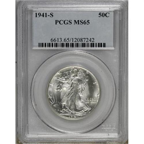 <B>1941-S 50C MS65 PCGS.</B></I> A shining and essentially brilliant short-set Gem, attractively preserved. The central devices show softness, typical for this weakly struck San Francisco issue.<BR><BR><B>Coin Engraver:</B> Adolph A. Weinman<BR><BR><b>Shipping:</b> Coins & Currency (<a target="_blank" href="http://www.heritageauctions.com/common/shipping.php">view shipping information</a>)