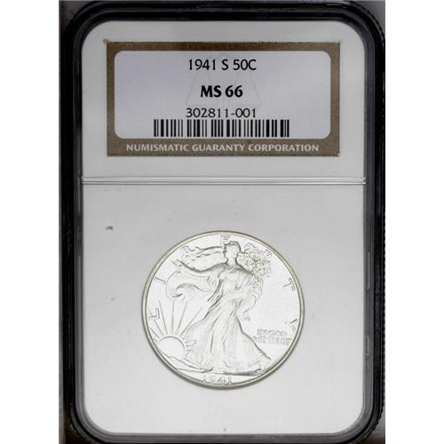 <B>1941-S<50C> MS66 NGC.</B></I> Lustrous surfaces display faint traces of milky-tan patina under magnification, and have been caringly preserved. The design features are well struck, particularly on the gown lines. Census: 130 in 66, 10 finer (3/06). <BR><BR><B>Important notice:</B> Heritage usually auctions material at the rate of 200-250 lots per hour. On some occasions eBay Live bid software or the Internet may not be able to keep up with the pace of the auction. We recommend placing a realistic absentee bid now as insurance to avoid disappointment. Occasionally the auctioneer may eliminate or reject an eBay Live bid, and the auctioneer may also reopen a lot after the close of the eBay live bidding (usually because we missed an audience bid), and may reject your bid even if it shows you as the winning bidder. By bidding via eBay Live, you agree that Heritage may award the lot to another bidder at its sole discretion under the circumstances described above or any other reasonable circumstances. Since eBay bids are not shown to us until we open the lot on the floor, we treat those bids just like floor bids. In most cases the floor responds before the eBay bid is presented to us, due to Internet lag time, so for consistency we have made it a policy that floor bids are always considered first over tie eBay live bids. Also please note that all Heritage lots purchased through eBay Live carry a 20% Buyer's Premium. Please make sure you read the Terms and Conditions before you bid. This lot is being auctioned in conjunction with a live floor auction by Heritage Galleries & Auctioneers. All final auction and invoice information will be supplied by Heritage Galleries & Auctioneers, and all other information should be considered preliminary. Lot:2995 <BR><BR><B>Winning Notification and Billing:</B> After the FINAL session in this auction is complete, Heritage will send e-mail and snail mail invoices. This process normally takes several days. All final auction and invoice information will be supplied by Heritage Galleries & Auctioneers, and all other information should be considered preliminary. <BR><BR>This auction will be conducted on a live auction floor and over the Internet through eBay Live. If you choose to place an absentee bid, please take a moment to <font color='#0000ff'><u><a href='http://pages.ebay.com/liveauctions/help/before/laabsentee.html'>learn how eBay Live absentee bidding works</a></u></font><font color='#000000'>