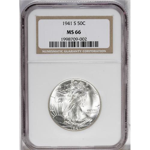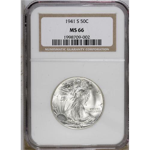 <B>1941-S<50C> MS66 NGC.</B></I> The short set key, here represented by a brilliant, problem-free, silver-white Premium Gem. The radiant surfaces are coated with a thick layer of mint frost, one that is free of all but tiny luster breaks. The strike through the center, while not sharp, is better than on most specimens of this elusive issue. NGC has certified 13 pieces finer (9/06).